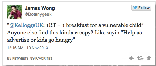 If you want your brand to go viral then make sure it’s for the right reasons. It’s surprising how many big brands have got it very wrong over the years. Take Kellogg’s UK for example, they tried the ‘Retweet to feed a hungry child campaign’. Kellogg’s campaign to raise awareness of their Give a Child a Breakfast charity program famously backfired after they sent the tweet below.